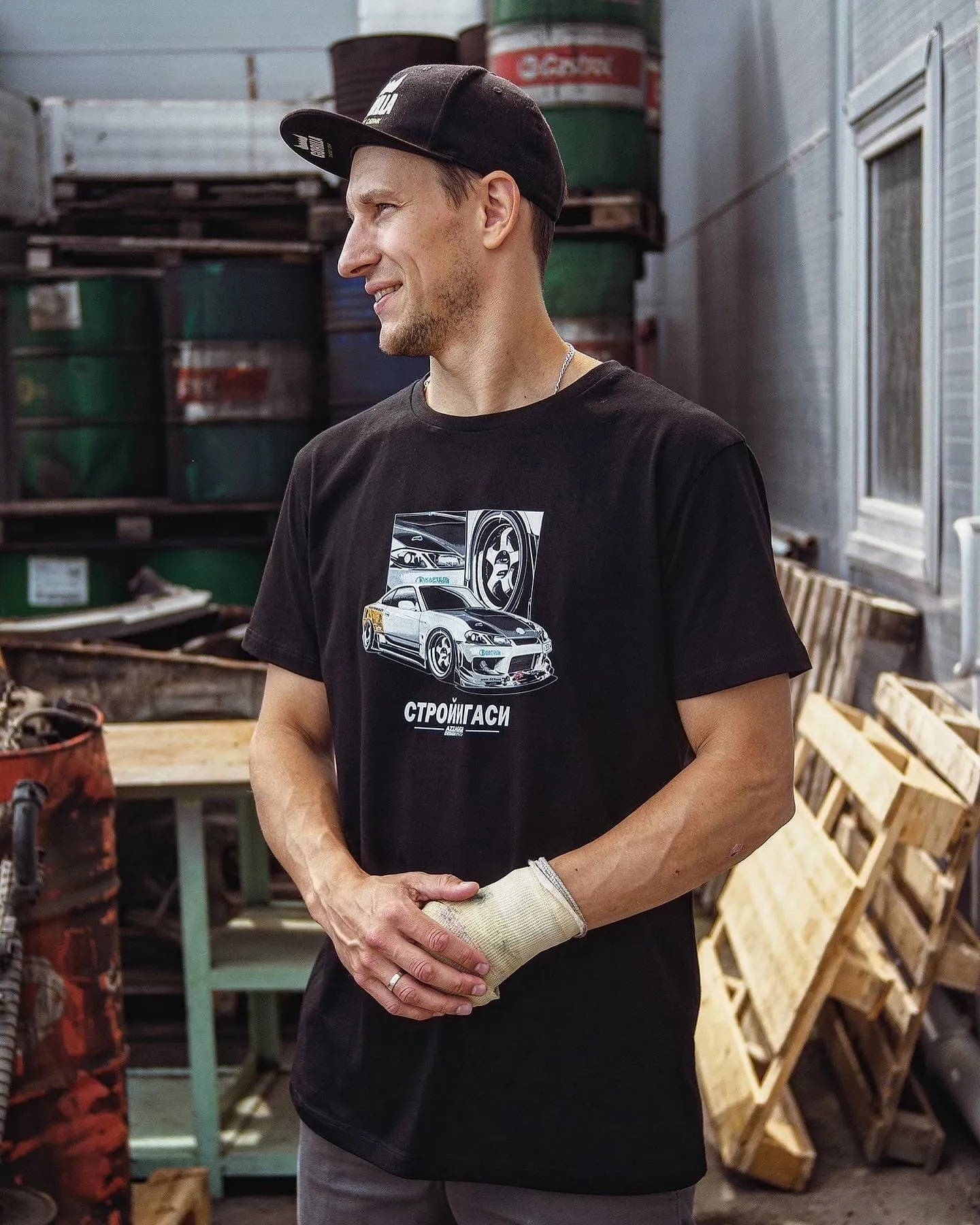 Для бренда "Строй и Гаси" мы выполнили прямую печать на футболках, применив технологию с исключением черного цвета из палитры. Этот прием создал оригинальный визуальный эффект — печать выглядит глубоко и натурально, гармонично сочетаясь с цветом ткани и подчеркивая фирменный стиль бренда.